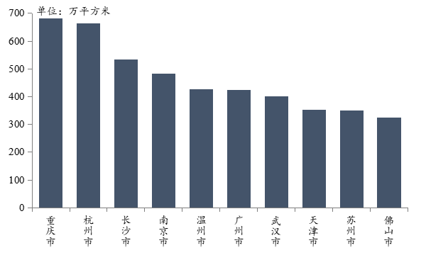 从上半年来看,重庆、杭州及长沙的土地较受欢迎,位列代表房企拿地城市面积前三。中指研究院的数据显示,今年上半年,50家典型房企拿地面积TOP10城市中,重庆累计拿地面积位列排名前列,杭州和长沙占据第2、3名。温州、佛山作为非集中供地城市入榜,分别位列第5、10名,其中佛山为TOP10城市中少有三四线城市,反映出该城市颇受房企关注。