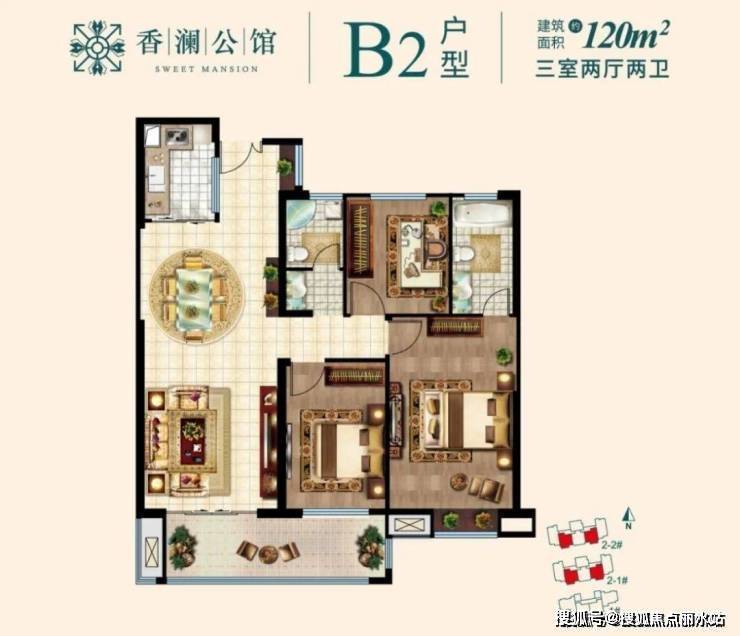 户型点评:120平位于2-1、2-2号楼中间户,也是三房两卫设计,自带南向6.6米超大阳台,采光、通风效果好,但是厨房没有窗户,可以做成透明隔断,增加空间感。