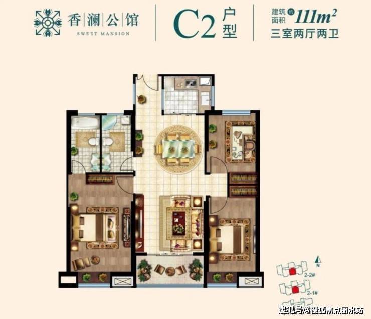 户型点评:111平位于2-1、2-2号楼中间户,三房设计,三开间朝南,北面是连廊,实现了南北通透,但北面卧室私密性一般;该户型是是一个非常实用的三房两卫,利用率高,基本无浪费面积。