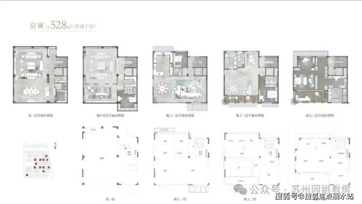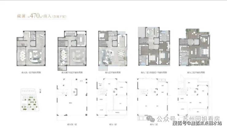 联排三款户型,建面约380㎡/470㎡/528㎡,均为地上三层设计,地下室地下挑高5.6米,可隔2层。