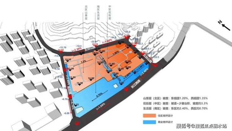 项目原始地形20米的高差挑战,被转化为项目的独特优势—通过台地式布局,形成“山景层-花街层-生活层”的三重功能空间序列。