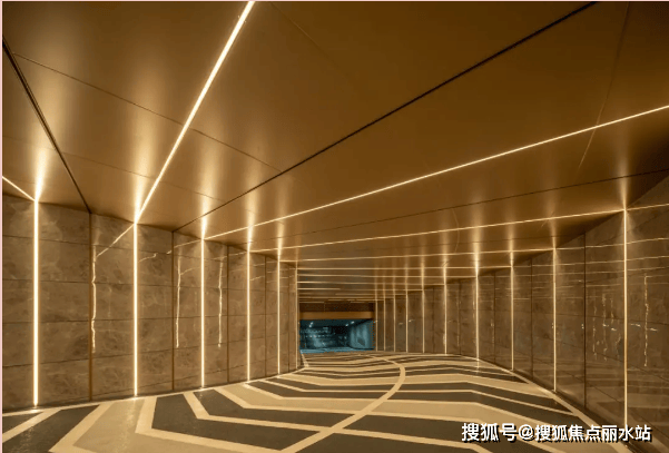 设有地上、地下双重归家动线,车库入口采用希腊灰奢石岩板、铝板与金属格栅打造,坡道设发光灯膜,营造梦幻归家体验。
