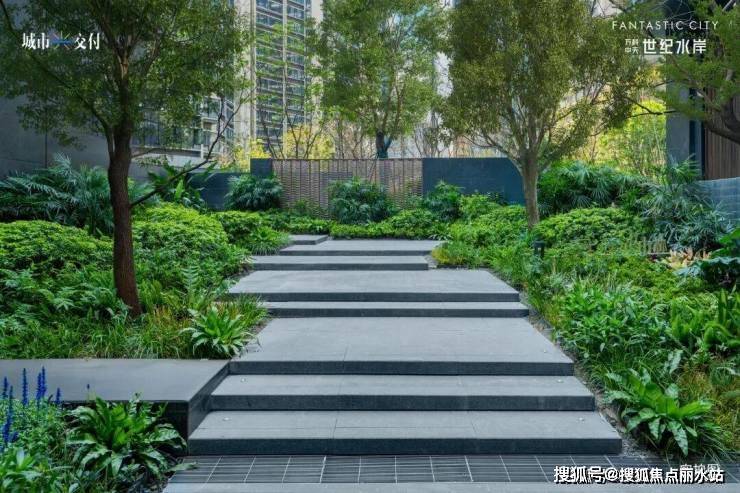 随青石板台阶移步向上,乔木葱茏簇拥,树影斑驳洒落,将归家路径转化为一场沉浸式艺术巡礼,更有步步高升的寓意。