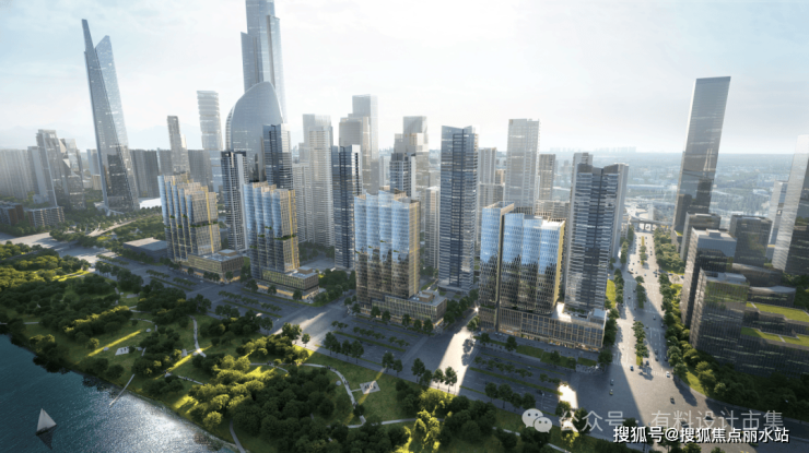 在立面细节传达上,设计以错动且转折的玻璃单元,转译江面波光闪烁的视觉意象;浅香槟金铝板搭配玻璃幕墙,奠定现代精致底色,规避工业化冰冷感。设计借生态绿轴串联空间,形成“建筑—绿地—江景”生态闭环。“风帆”“远航”更承载江城开拓品格,为使用者构建兼具景观与精神共鸣的滨江人居。
