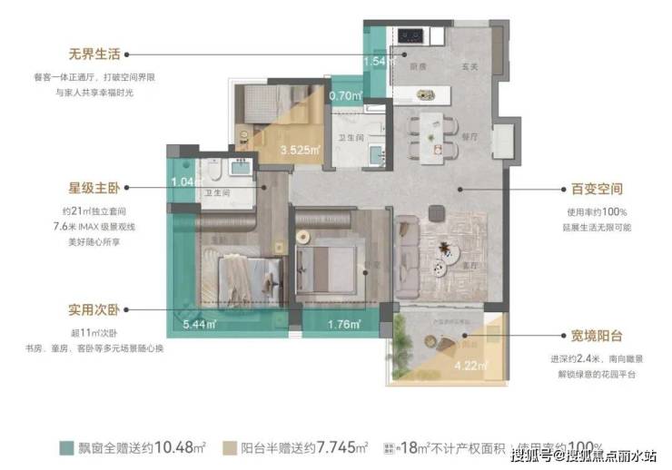 全屋飘窗全赠送约10.48㎡,阳台半赠送约7.745㎡,整体赠送面积约18㎡,让87㎡的建面,真正成为87㎡的生活现场。