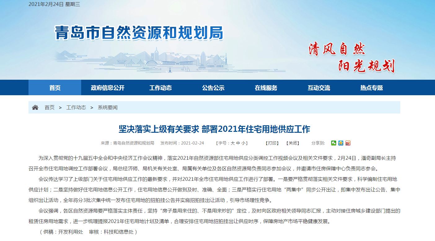 2月24日,山东省青岛市自然资源和规划局官网发布《坚决落实上级有关要求 部署2021年住宅用地供应工作》的通知。
