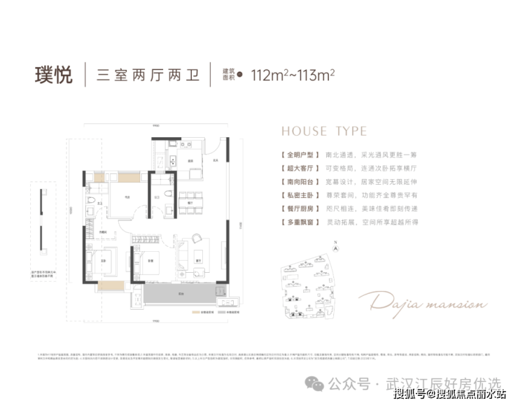 三开间朝南,南向面宽和进深会更大,开间接近10米;动静分区,公区一体化设计,客厅与南向次卧没有承重墙的限制,改造性更强,也可做大横厅;全屋三飘窗+大阳台,更多的可拓空间,更高得房率,主卧套房,自带步入式衣帽间和独立卫生间。