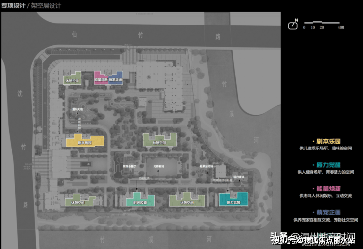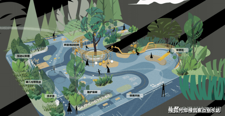 园区十字对称中轴,在感性中给予景观与建筑理性的思考,合理布置彼此空间关系与艺术搭配,辅以5大全龄主题架空层,构建复合式全龄生活。