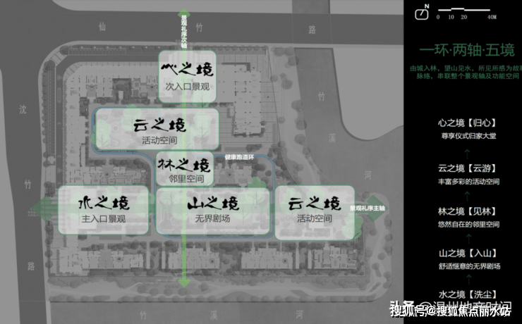 “五境”洗尘-入山-见林-云游-归心,延伸“家”的范畴,凝聚无界社交园林空间,以超凡脱俗的设计理念,还原瓯越千年的诗意风景。
