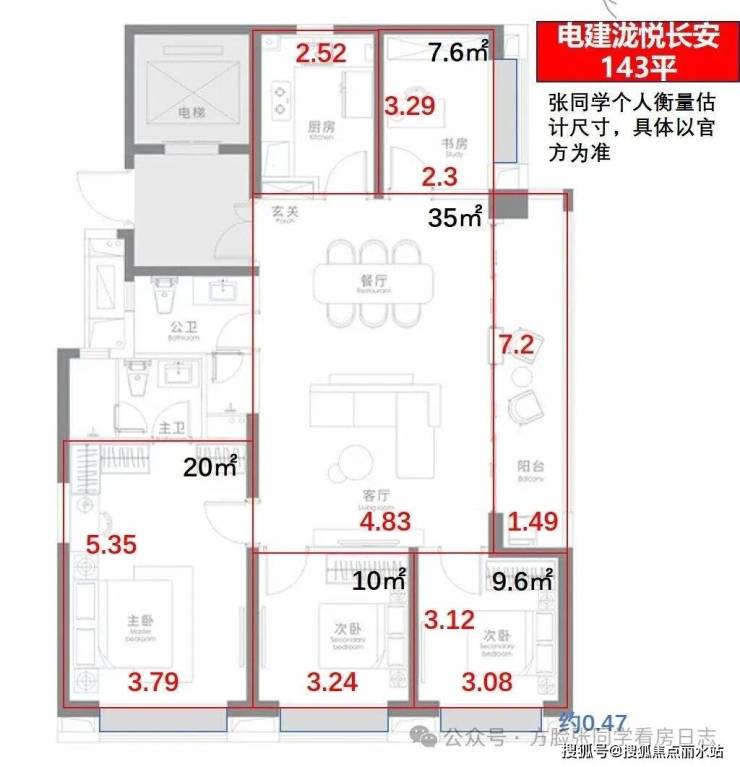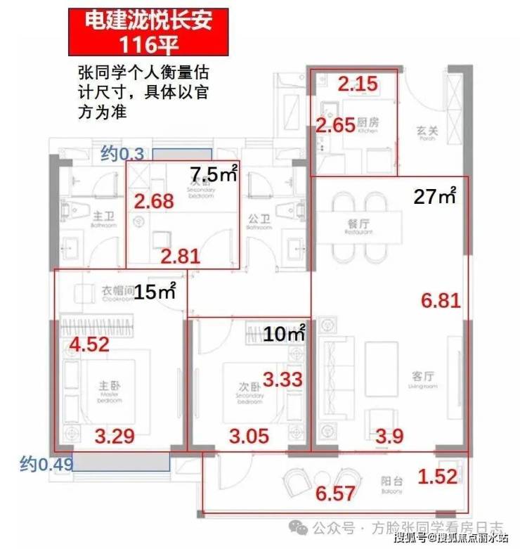 首先是电建116平中间户,这是我根据阳台尺寸反推的各个空间尺寸。