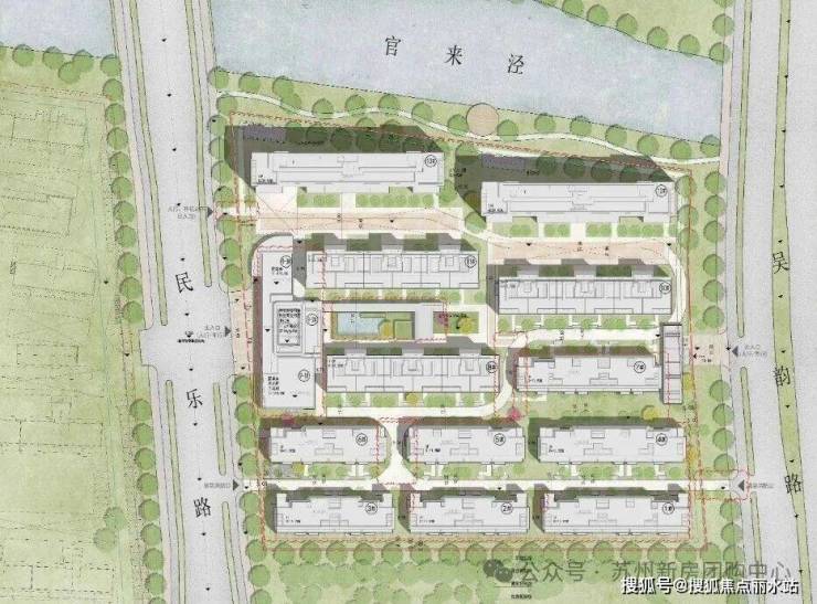 整个项目南低北高分布,将采光优势发挥到极致;在出入口设计上,主入口设在西侧民乐路,次入口位于东侧吴韵路,双向便捷通行,既保证了归家的从容,又兼顾了生活的高效。