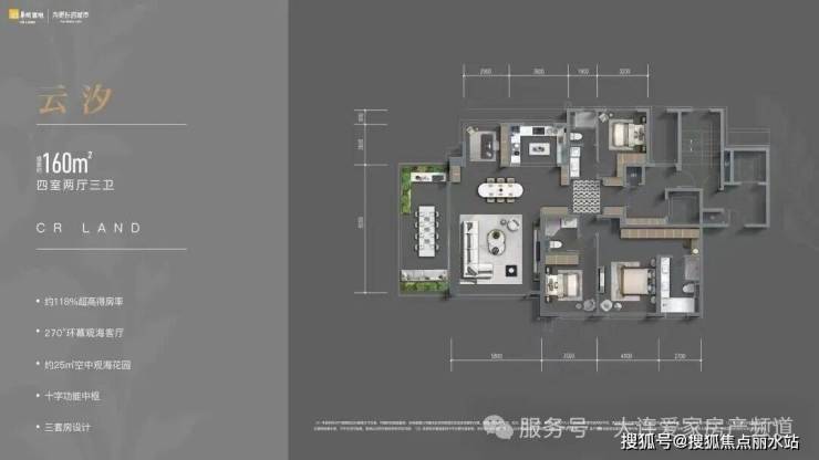 小高层(17层顶):160平四室两厅三卫,一梯一户,得房率约118%,270°环幕观海客厅、约25m空中观海花园、十字功能中枢、三套房设计。