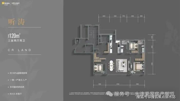 小高层(17层顶):120平三室两厅两卫,一梯一户,得房率约100%,一梯一户独立入户、多功能收纳系统、约6.5米宽厅。