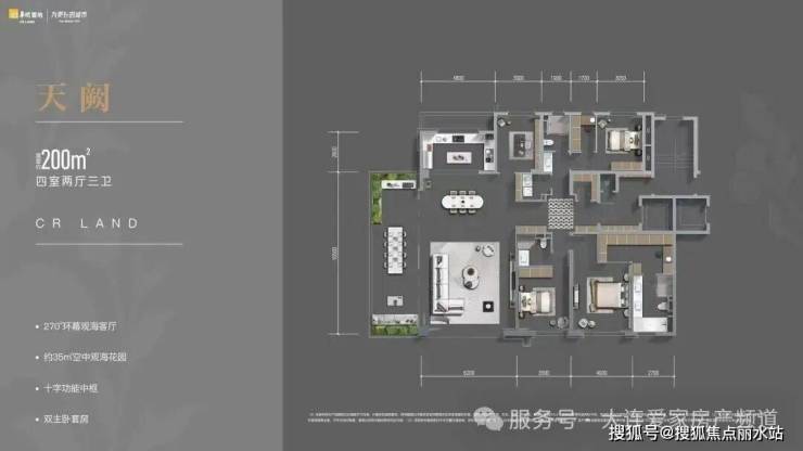 小高层(17层顶):200平四室两厅三卫,一梯一户,得房率约120%,270°环幕观海客厅、约35m空中观海花园、十字功能中枢、双主卧套房。