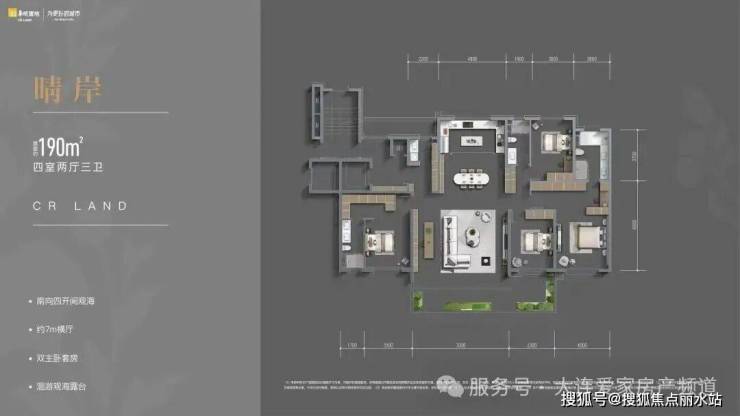 小高层(17层顶):190平四室两厅三卫,一梯一户,得房率约112%,南向四开间观海、约7m横厅、双主卧套房。