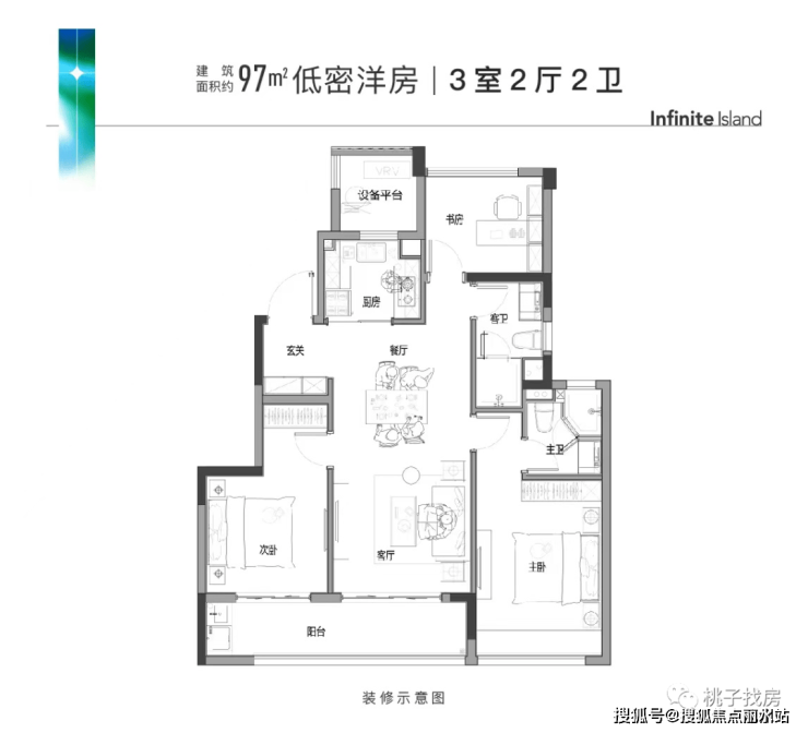 建面约97㎡起步户型,三房两厅两卫格局,南向三开间,次卧与客厅的阳台相连,打造大尺度的双联阳台,还有很大的亮点就是玄关设计,可以很好地护好后期业主的隐私。