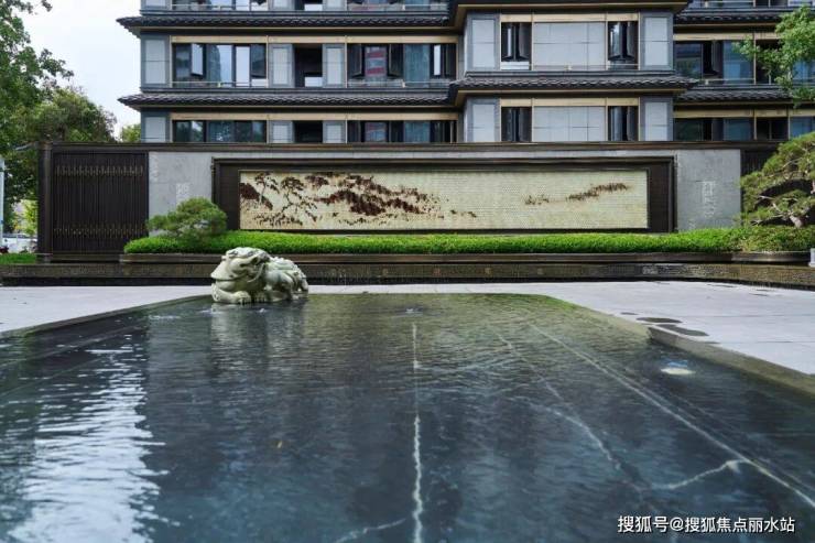 门前的水景“砚池映月”更有讲究,圆润的“中国黑”上,子母狮侧卧,寓意守护家园