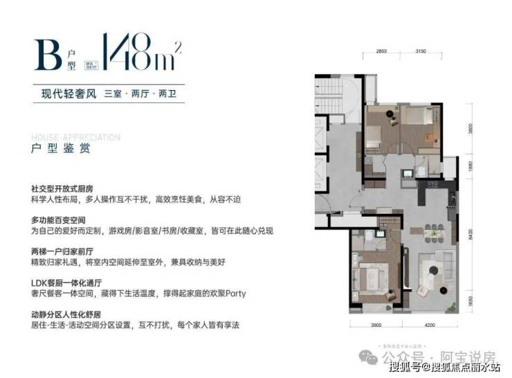 此户型精准瞄准了多人口家庭的需求。南向双套房的设计堪称典范,完美解决了主卧与老人房之间的隐私与起居干扰问题,是家庭和谐的“稳压器”。LDKG一体化设计让公共区域显得大气磅礴,岛台厨房更成为家庭的情感交流中心。