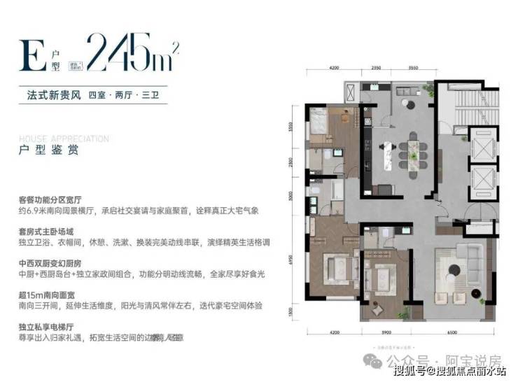 作为楼王,245㎡终于挣脱了商改住的枷锁。约6.5米南向横厅与近14.6米南向面宽,带来了碾压级的采光与视野,彻底告别了“长进深”的压抑感。中西双厨与独立家政区的明确分区,意味着生活方式从“居住”升级为“宴请”与“享受”,符合顶豪的身份定位。