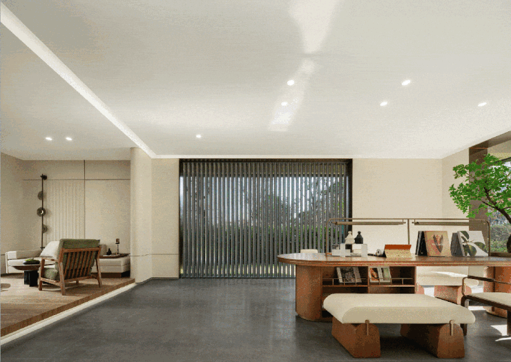 阳台与餐客厅采用一体化设计,形成“巨无霸”公共区域。孩子在客厅搭积木,大人在阳台喝茶观景,视线不脱节,陪伴更自在;