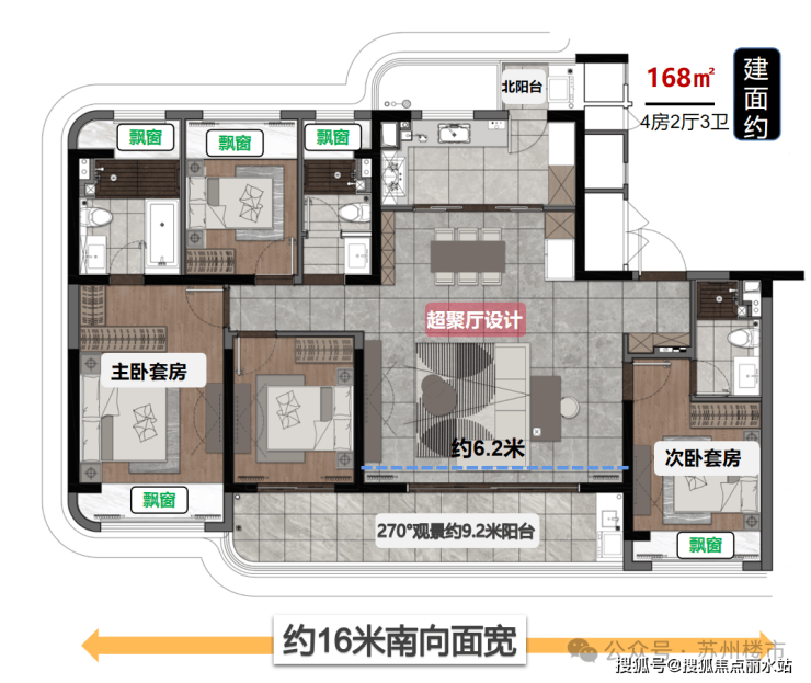 建面约168㎡户型最直观的优势,就是“够舒展”:四开间朝南,南向总面宽约16米,相当于把 “阳光客厅”“舒适卧室”“观景阳台” 统统搬进了南向视野里。