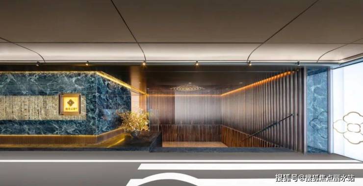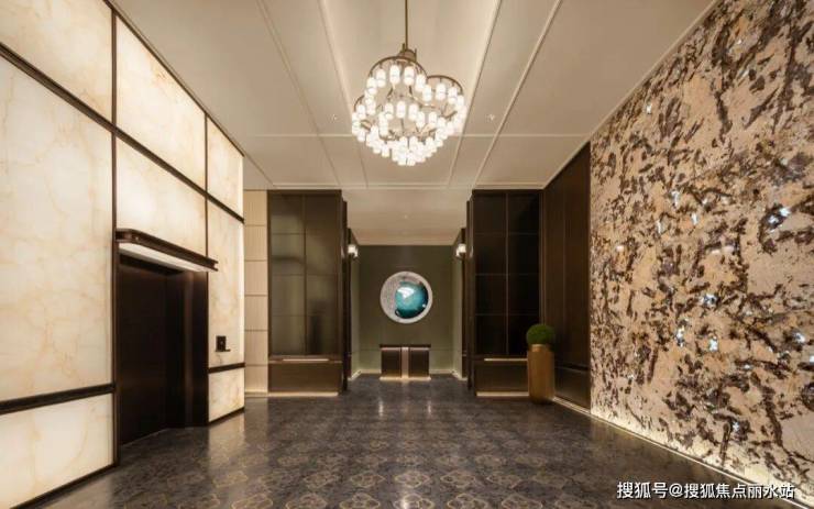 入口大堂地面通铺的是来自意大利的「范思哲黑」石材,这种石材不仅通铺在大堂的地面,还通铺到了楼梯,甚至通铺到了整个地下会所的空间。会所的电梯厅搭配一整面「雪山银狐」,地面用铜丝镶嵌LOGO。