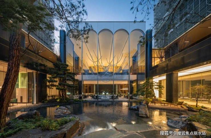 翠意流金的超50米宽、净高约6.45米的敞阔门庭,矗立一面艺术雕塑,在晚风中闪着荧荧微光,昭示着家的方向;沿着酒店式落客归来,中央迎宾水景、静水微澜与跌水如瀑交汇,塑造层层叠翠归家仪式,随之步入高奢酒店级大堂,铺展生活的序章。