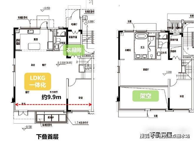 下叠面宽约9.9米,一层为前庭后院双入户与LDKG一体化,大横厅是一大亮点;客厅上空是挑空空间,未来可打造为双套房设计。