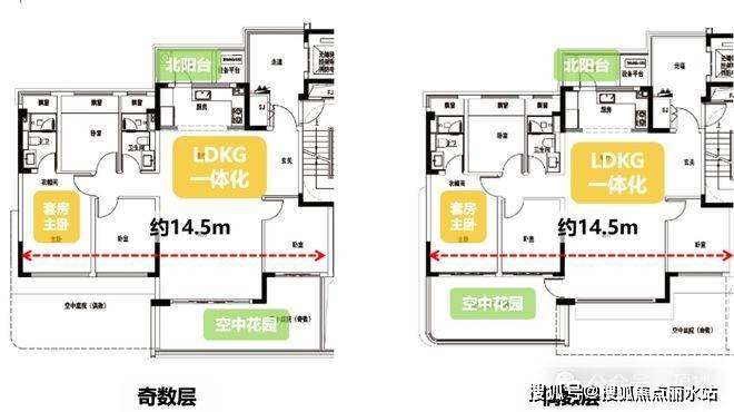 四代宅洋房整体户型为4房2厅2卫,4开间朝南设计,奇数层与偶数层的区别就在于,空中庭院与客厅或卧室相连的区分;并且值得一提的是,项目还打造了北阳台。