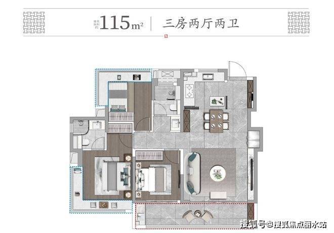 建面约115㎡:边户,三室两厅两卫,正3房+1X可变空间,主卧独立衣帽间,主次卧双转角飘窗,约37㎡客餐厨家庭欢聚空间、带西厨岛台交付!这个户型综合使用率达到87%,赠送面积约13.32㎡,收纳面积达到11.8㎡,丝毫不输市面上的最新产品!