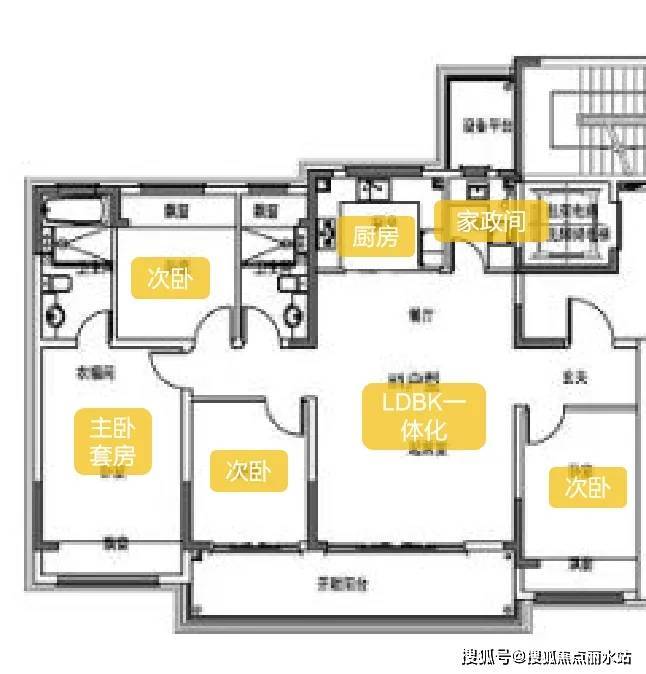 4房2卫设计,四开间朝南,南向面宽约14.6米~值得一提的是,这个户型还带了一个家政间,使得后勤空间更加充足;主卧开间为3.6米,套房设计,其他房间的空间感也不错~