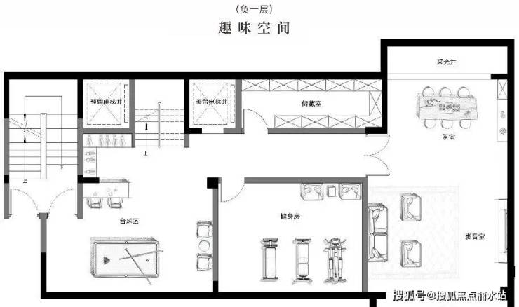 负一层可作为一个私人会客厅。根据居者需要打造娱乐空间,健身房、台球区、影音室等,家人团聚、好友聚会、洽谈生意,每个家庭成员都可以自得其乐