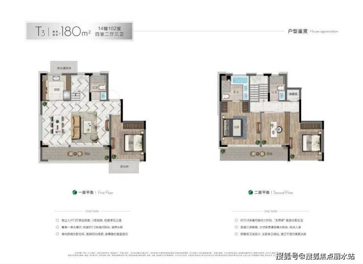 其中下叠约180㎡四房三卫户型,一楼客餐厅开间约7.2米,不仅彰显了生活的宽绰气度,更带来室外的明媚风景,加上约3.2米层高,大宅气质自显,首层次卧开间约3.6米,二楼主卧开间约4.2米,连通书房与主卧的阳台长约7.2米,大气通透。