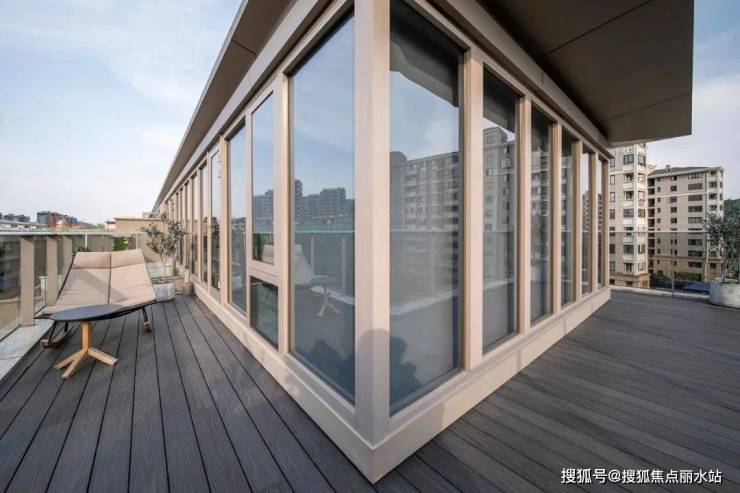 立面上,超高的窗墙比、木纹质感的铝面型材、45度倒角设计“油画式”窗框,不仅更立体,功能性也很显著增加了20%的室内采光量,也让居住者的空间更通透,建筑通透而轻盈,除了带来宽屏的视野,夜幕之下,灯光亮起,建筑犹如悬浮空中的玻璃盒子,房子仿佛空中的梦幻城堡。