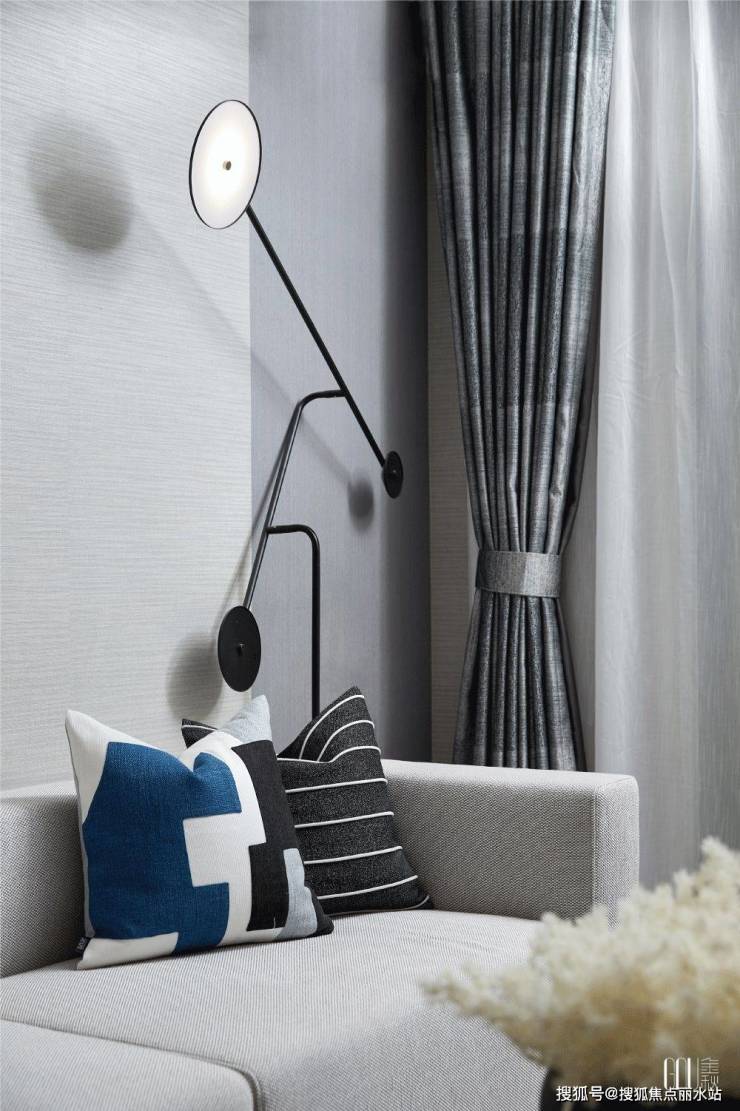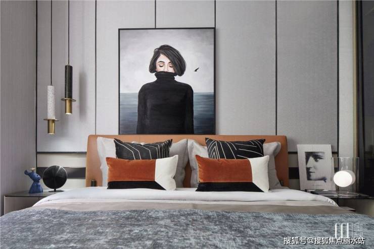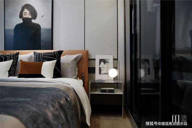 如果说客厅空间的设计相对收敛了个性的表达,主卧则在家具与饰品的选择上,将时尚气息充分地释放出来。吊灯的陶瓷质感、靠垫的条纹延伸了客厅的风格,一幅吸睛的装饰画,把我们的思绪拉回当下,感受安静的力量。