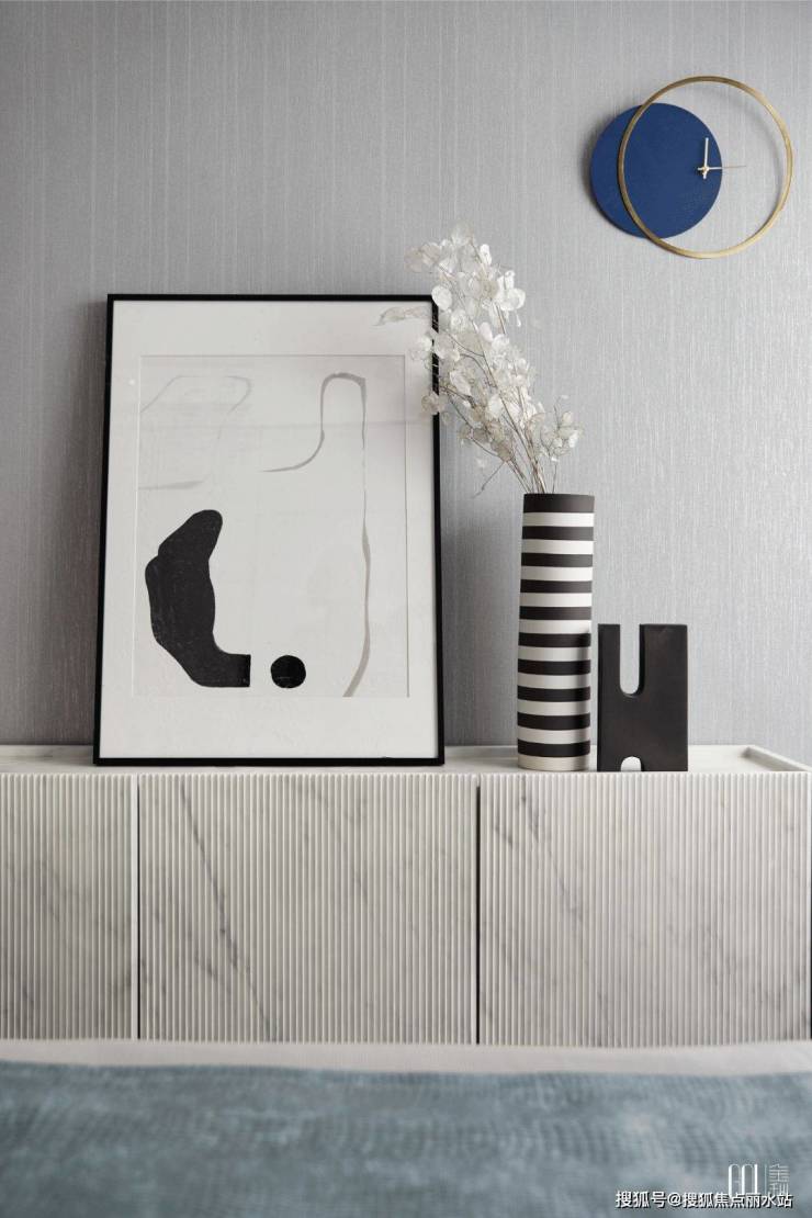 客厅空间褪去浮华的装饰,以素白与雅灰为主,小面积的咖色与蓝色带起节奏感。从陶艺文化中萃取而来的元素,化为各种性格鲜明的线条、形状和肌理,充斥在空间的细节处。艺术与生活的边界在此弥散,营造出静谧而有格调的闲适光景。
