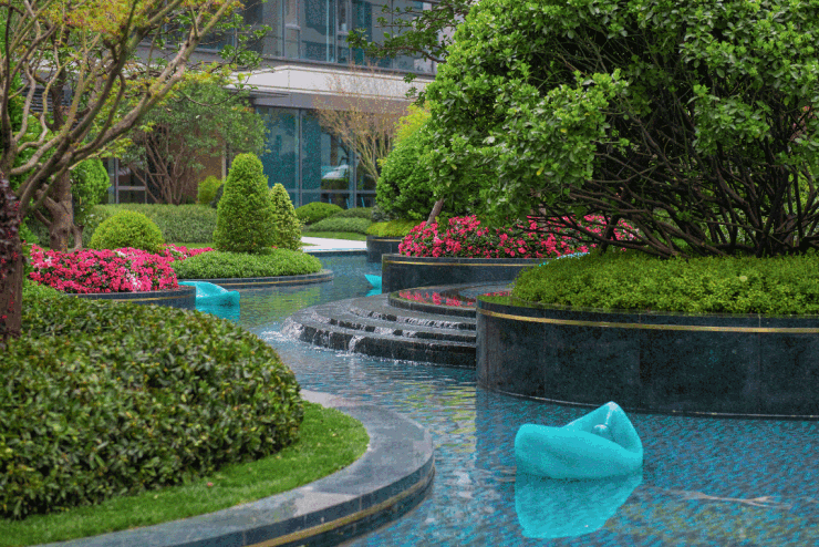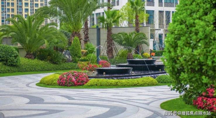 设计利用景观树阵、规则草坪、模纹花坛、水景雕塑等,打造自由式的景观布局,灌木和小乔木、花卉植物组合,拥有丰富的颜色层次,局部摆放雕塑小品增加活泼的社区氛围,形成开合有序的景观空间。