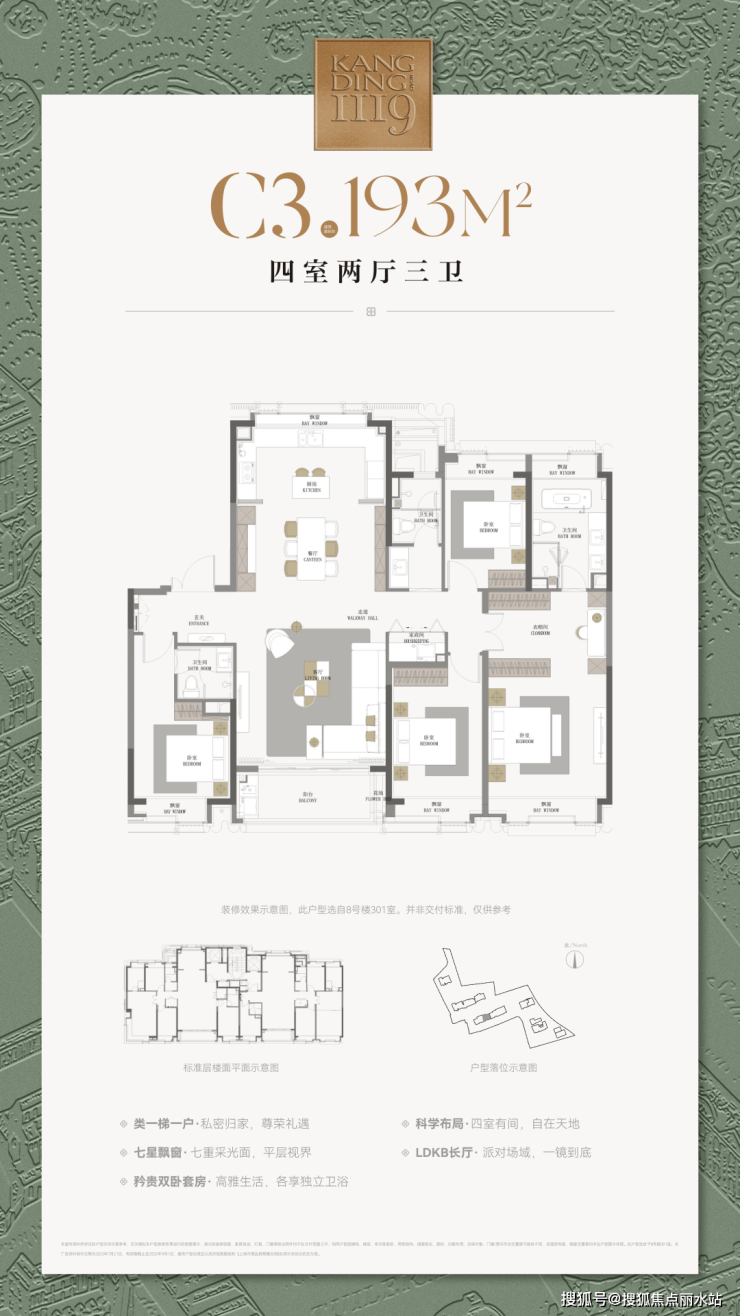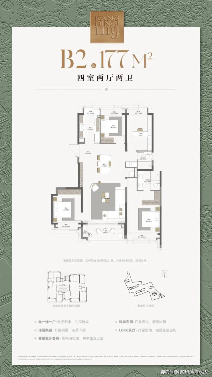 建面约177㎡四房户型,全屋不计入建筑面积的空间接近20㎡,相当于多出一间主卧的面积;LDKB一体化设计,将客厅、餐厅、阳台整合为约40㎡的超级社交空间;
