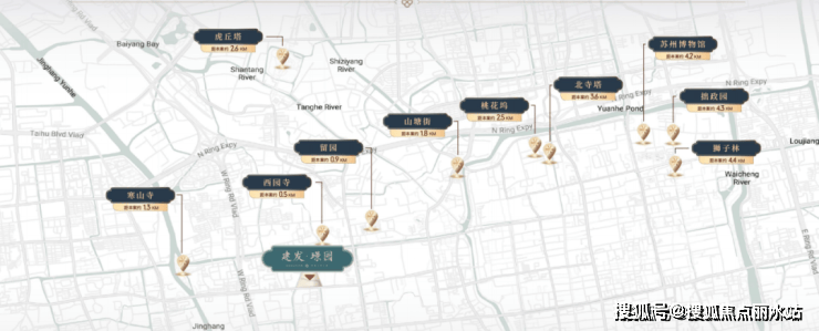 建发·璟园,盘踞城市文化遗产中轴上,周边约5公里内享西园寺、寒山寺、山塘街、留园等10处名胜古迹环伺,驾车约15分钟即可到达。