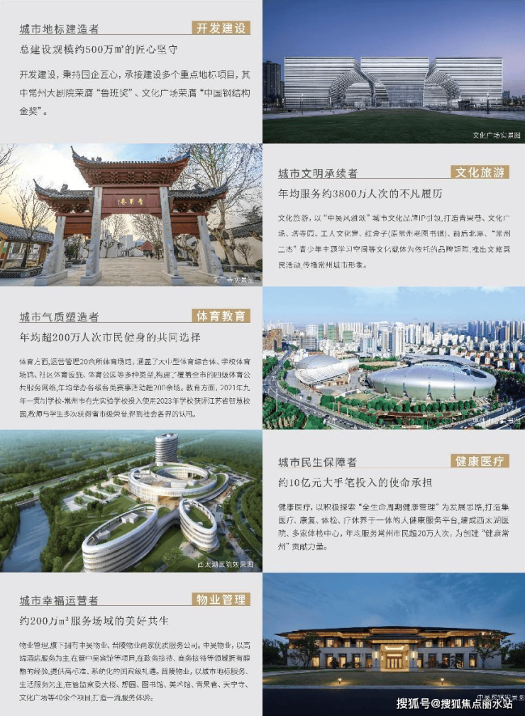 近年来,集团投资建设青果巷历史文化街区、常州文化广场、大运河风光带、天宁寺景区、西太湖医院等城市公共项目,以及众多城市文化教育体育设施,见证集团“建设美好城市,点亮民生幸福”的服务理念。