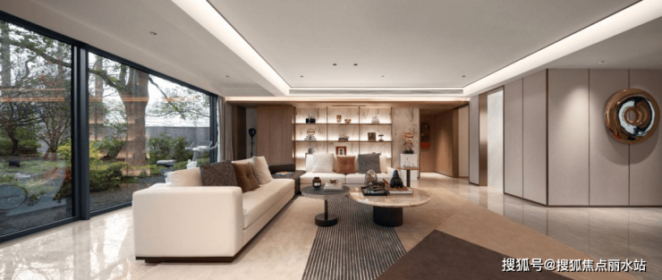 横向落地窗带来明亮的采光,给予起居室开放、无界限的多样化可能
