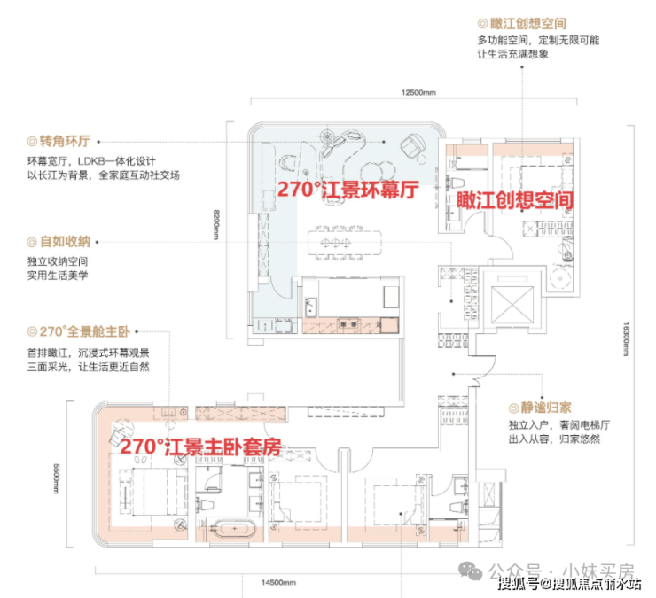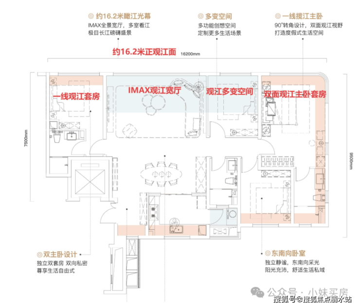 项目建面约143㎡打造了约16.2米IMAX级观江面,实现了客厅+次卧+双主卧四面观江,其中东主卧还做了弧形转角窗设计,能无遮挡270度双面观江。