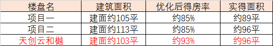 从表格数据直观来看,同样一套建面约103平的户型,天创云和樾优化后实得面积可达约96平,比别的项目优化后面积直接多出一间房。