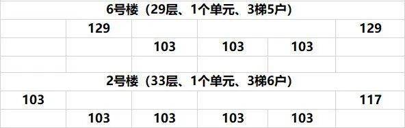 项目主推的高层2、6号楼,分别是3梯6户和3梯5户的格局,包含建面约103-129平房源,其中建面约103平位于6号楼中间户、2号楼中间户和边户。