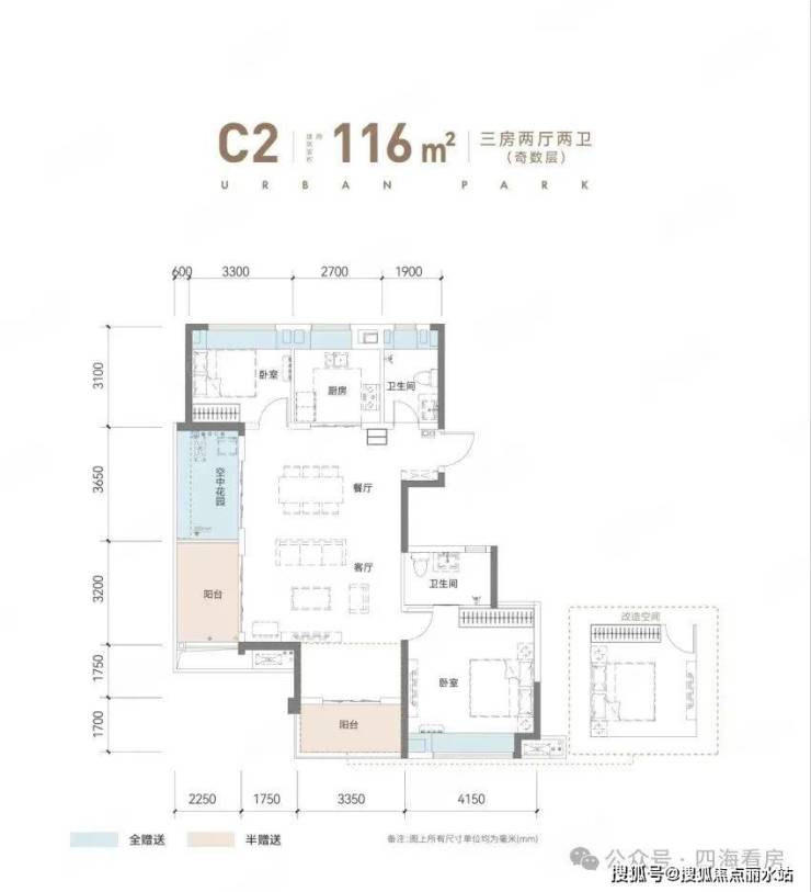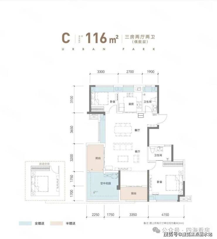 G3号楼建面约 116 ㎡户型: 4个飘窗1个空中花园全赠送,还有两个阳台,阳台尺度非常大,2.25米的进深,这么多年在武汉没见过,整个户型3面采光,客餐厅无过道无浪费,非常绝!