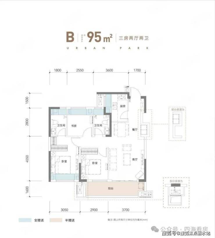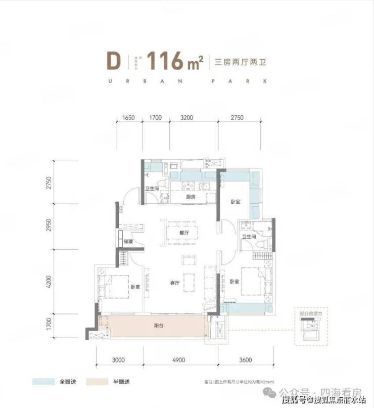 G3号楼建面约 116 ㎡户型: 5个飘窗全赠送,室内无过道设计,动区空间超级大,南向近8米开间的大阳台,进深也有1.7米,空间超级大,虽然已经很好了,但我觉得它还不算很惊艳!