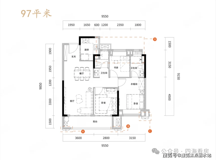 G2号楼建面约95㎡户型: 95㎡做三房两卫,5个飘窗全赠送,还有一个南向双阳台,这种户型在武汉市还比较常见,这只是一个开胃小菜。