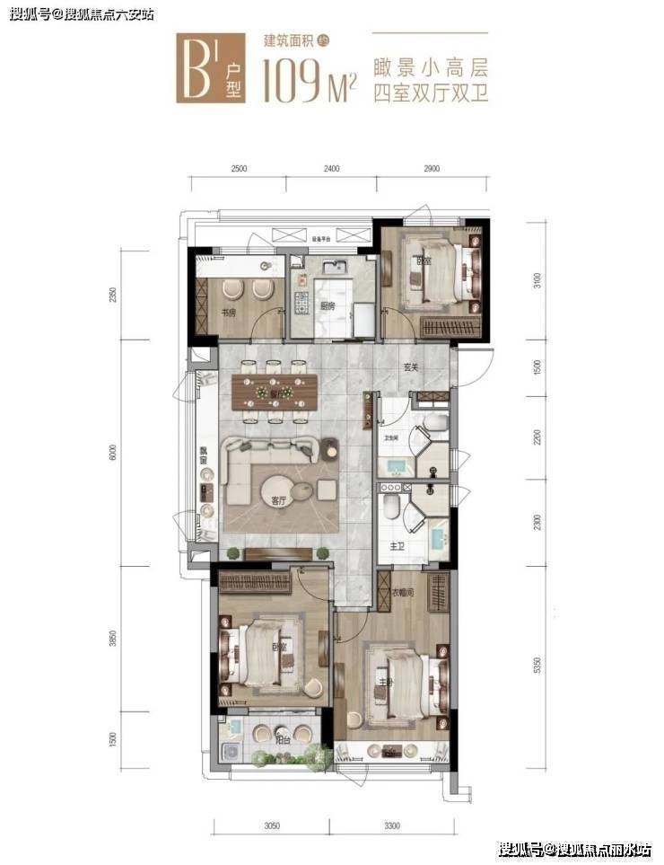以小高层建面约109㎡的边套为例,居然做到了四房。这是充分考虑到了孩子上学后的住房需求,因为老人很可能要住过来照顾孩子,一家三代人,四房肯定要的。