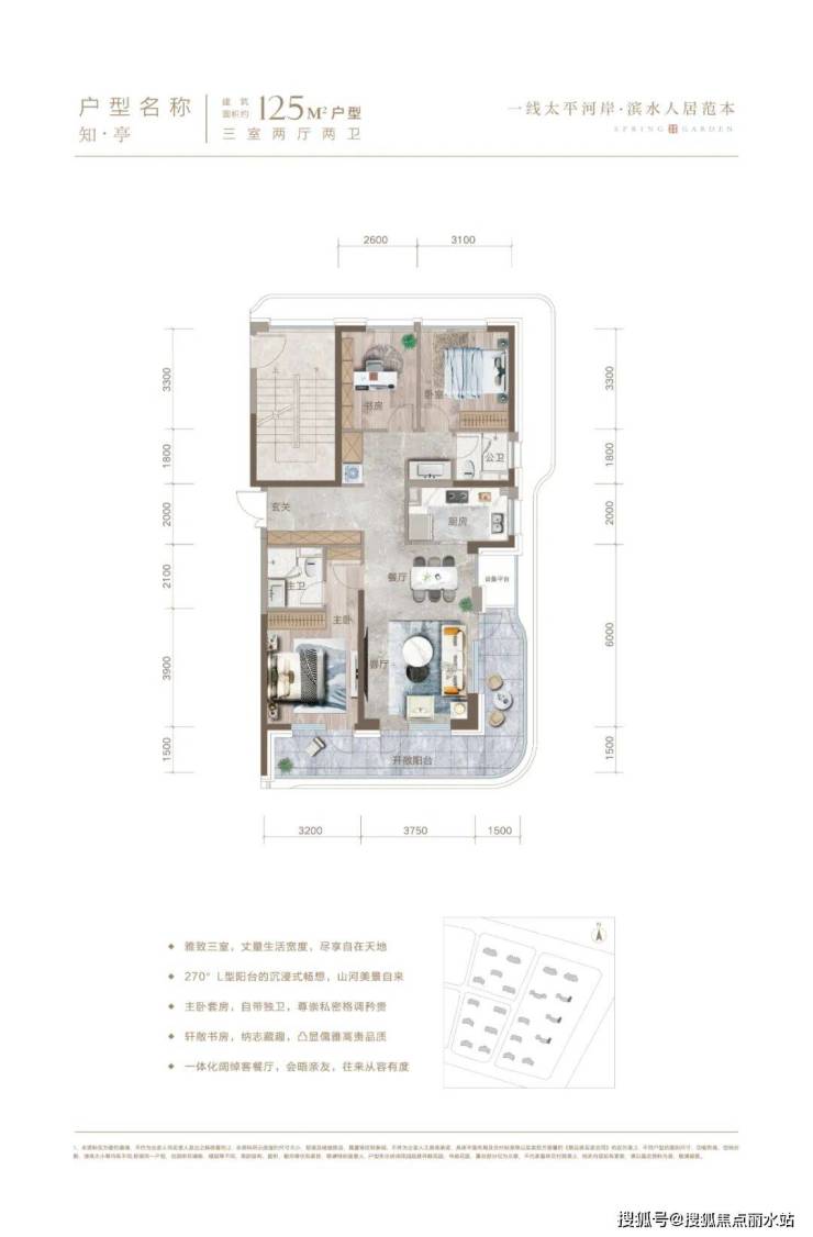 建筑面积125㎡,三室两厅两卫。雅致三室,丈量生活宽度,尽享自在天地。270°L型阳台的沉浸式畅想,山河美景自来。主卧套房,自带独卫,尊崇私密格调矜贵。轩敞书房,纳志藏趣,凸显儒雅高贵品质。一体化阔绰客餐厅,会晤亲友,往来从容有度。