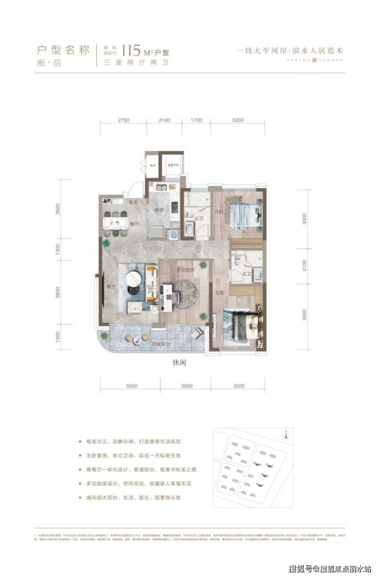 建筑面积115㎡,三室两厅两卫。格局方正,动静分明,打造尊荣生活风范。主卧套房,独立卫浴,自成一方私密天地。客餐厅一体化设计,直通阳台,揽春华秋实之景。多功能房设计,空间灵动,收藏家人幸福生活。南向超大阳台,生活、娱乐、观景皆从容。